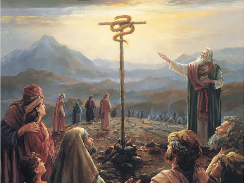 La serpiente siempre ha sido relacionada con la medicina, porque a ella se atribuían determinadas virtudes curativas. El autor del libro de la Sabiduría hace la exégesis del pasaje bíblico: "La serpiente era un símbolo de salvación que otorgaba la salud, no por la virtud de la figura que tenían bajo sus ojos, sino por Aquel que es el Salvador de todos" (Sab 16,6-7). Los israelitas, en tiempo de Ezequías, daban culto a una serpiente de bronce llamada Nejustán (de “nejóset”, bronce), y la consideraban como la utilizada por Moisés para curar a los israelitas (2 Rey 18,4). El piadoso rey la hizo despedazar para evitar los abusos idolátricos. Jesucristo alude al hecho del desierto, y ve en la serpiente levantada por Moisés un tipo de su elevación en la cruz: "Como Moisés levantó la serpiente en el desierto, así es preciso que sea levantado el Hijo del hombre, para que todo el que crea en Él tenga la vida eterna" (Jn 3,14-15).