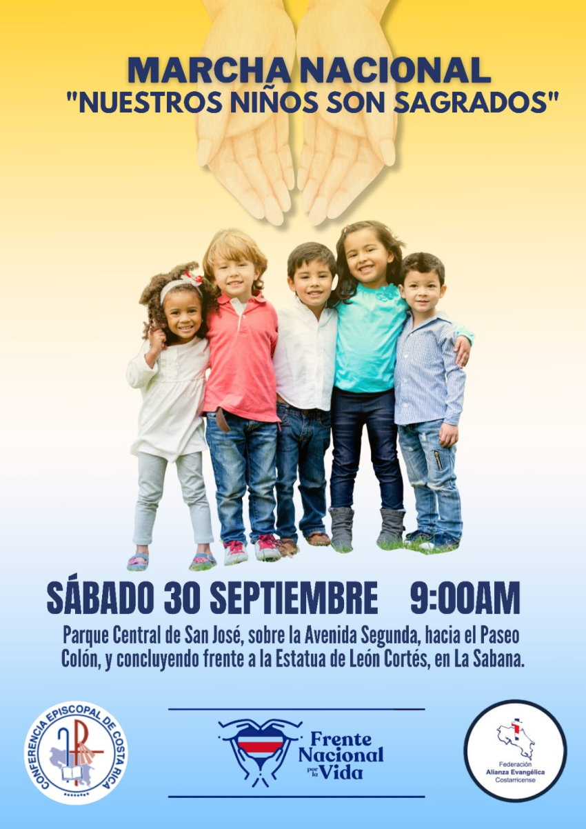 Con el objetivo unificar y empoderar a la sociedad en la defensa de los derechos de los más pequeños, este sábado pasan 30 de setiembre se llevará a cabo la Marcha Nuestros niños son Sagrados, la cual iniciará a las 9:00 a.m y saldrá del Parque Central, San José.