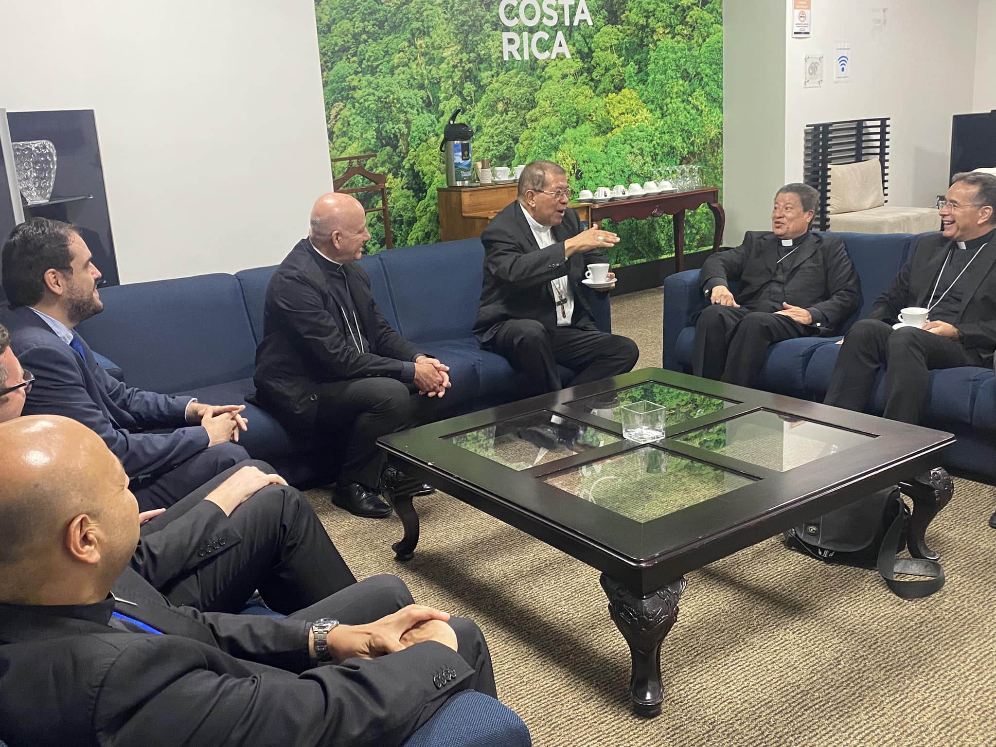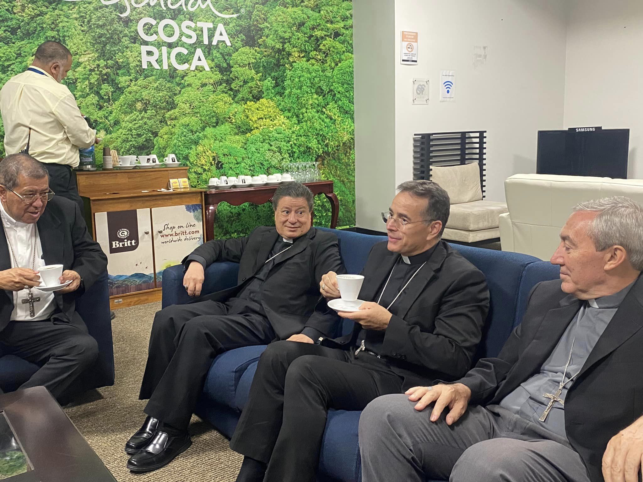 El el salón diplomático del aeropuerto, Monseñor Miles se deleitó con el café costarricense que tanto gusta también al Santo Padre.