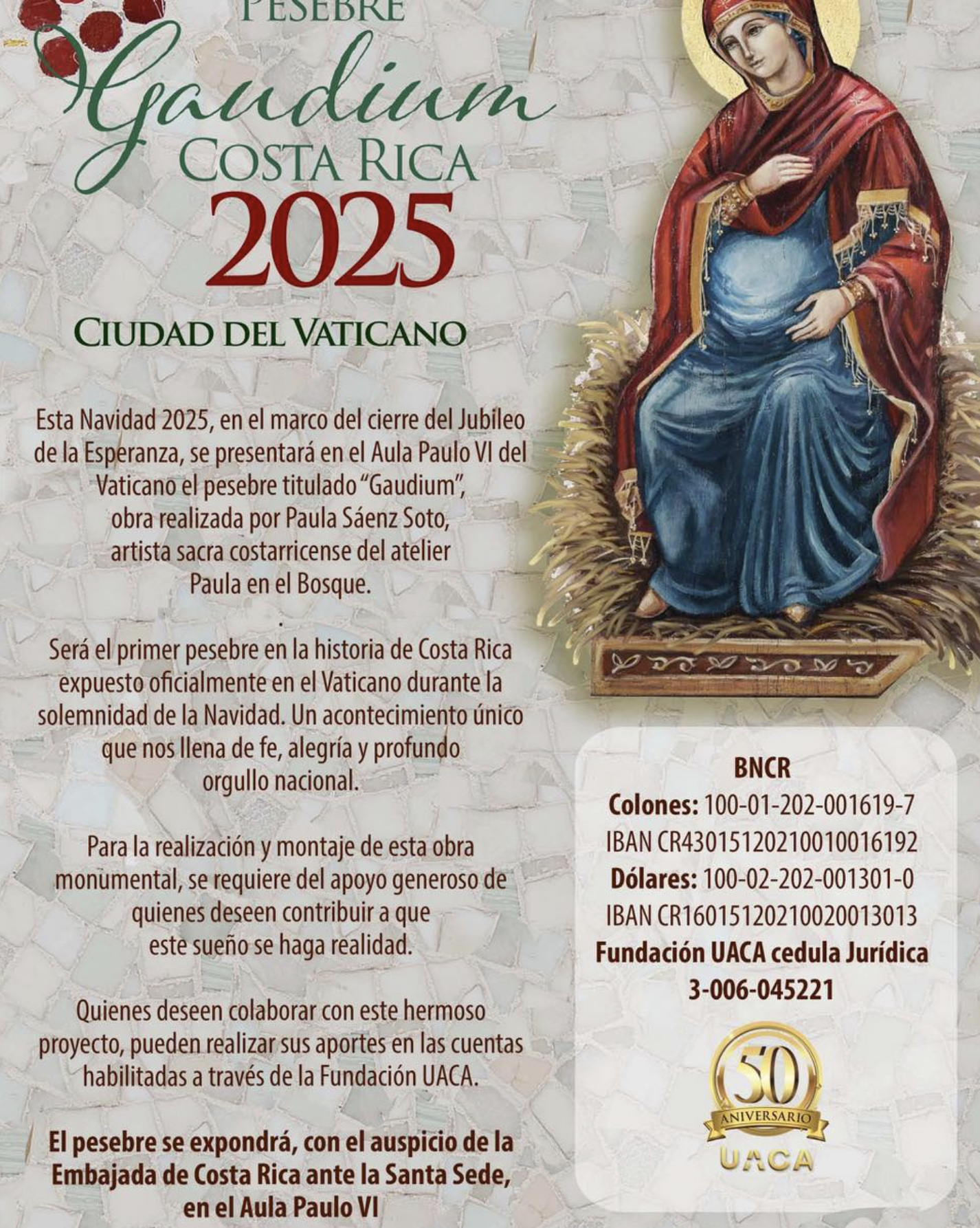 La presentación del pesebre Gaudium en el Vaticano, afirma Paula, no habría sido posible sin la labor de la Embajada de Costa Rica ante la Santa Sede, "cuyo auspicio y acompañamiento han permitido que esta obra pueda ofrecerse como signo de fe y de esperanza en el corazón de la Iglesia universal". A través de su apoyo, concluyó la artista, se hace visible también el compromiso de Costa Rica con la promoción de los valores de la vida, de la cultura y del arte sacro.