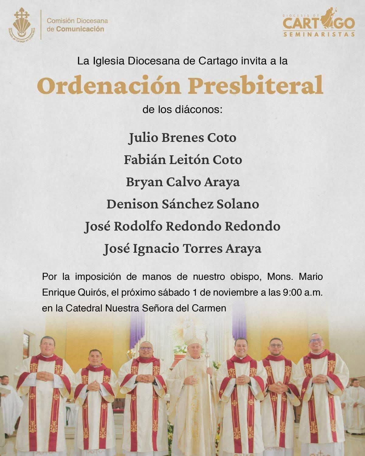 La diócesis de Cartago celebrará la Ordenación Presbiteral de seis jóvenes, el sábado 1 de noviembre, a partir de las 9:00 a.m., en la Catedral Nuestra Señora del Carmen. Conozca a los futuros pastores: