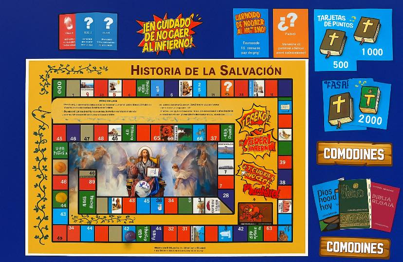 Por ejemplo, en un tablero de Gran Banco uno puede caer en la “Cárcel” por alguna penalización, pero en el Tablero Bíblico hay que cuidarse de caer en el “Infierno”. En el Bingo de Santos, los cartones tienen imágenes de santos o personajes bíblicos.