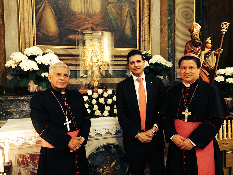 Mons. José Francisco Ulloa, Mons José Rafael Quirós y el embajador Sánchez durante la entronización de la imagen de la Virgen de los Ángeles en el Vaticano.