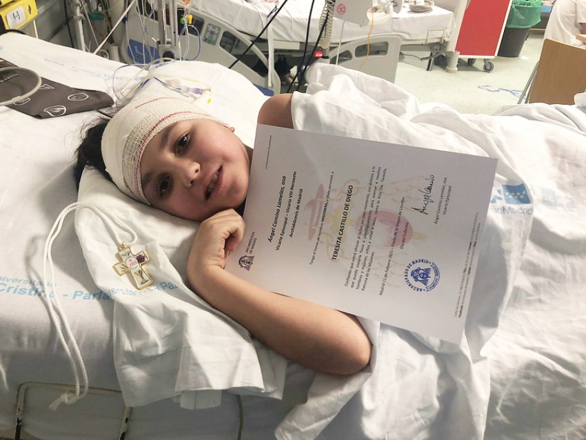 “Los capellanes, sabiendo mi costumbre, habían propuesto que fuera a visitar a una niña gravemente enferma, que la operaban de un tumor en la cabeza al día siguiente. Con muchísimo gusto acepté la propuesta. Hemos llegado a la UCI debidamente equipados, he saludado a médicos y enfermeras, y acto seguido me han llevado a la cama de Teresita que estaba junto a su madre Teresa. Un vendaje blanco rodeaba toda su cabeza, pero tenía la cara suficientemente descubierta como para percibir un rostro verdaderamente brillante y excepcional. La he saludado con todo afecto, indicándole que en ese momento venía en nombre del Sr. Cardenal Arzobispo de Madrid para traerle a Jesús.